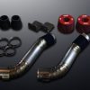 このチタンインテークシステムは、 F1やルマン等のレースで実績のあるBMC社に依頼した、専用設計エアフィルターをバンパー内に収めフレッシュエアーを吸入させます。純正フィルター開口面積に対し約1.4倍とコンパクトながらも高効率を実現。バンパー内に余裕ある配置と導風板も設置し、可能な限り機能性を高めました。バンパーを外さずに装着も可能です。パイプにはチタン材を採用し軽量化を図ると共に、純正の70φに対し80φまで拡大。その効果により純正エアフロメーターの計測信号も容量拡大方向にスライドするため、高出力タービンや大容量インジェクターなど、パワーアップアイテムとの組み合わせには欠かせない存在となります。